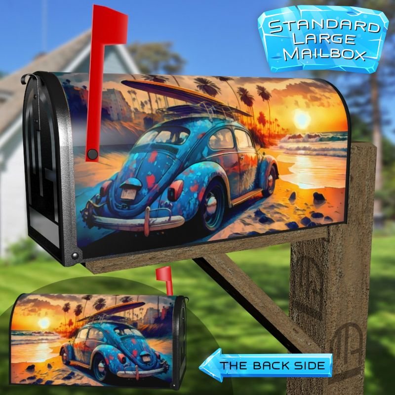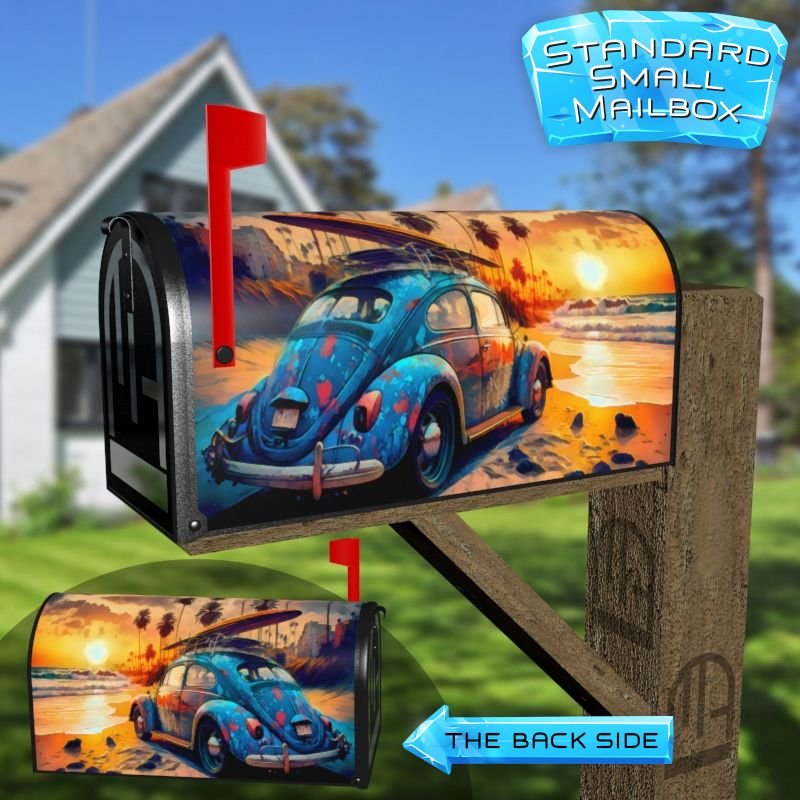 Dressing up your rural farm mailbox with the Volkswagen Beetle on the Beach mailbox cover is an easy way to convert it into a unique and special item. These covers require a smooth surface, so they are compatible with rural farm mailboxes that do not have any embossed decorations or signs. Magnetic mailbox covers work with steel boxes only, while self-adhesive vinyl covers are available for aluminum, plastic and steel boxes. If your mailbox is not compatible with these covers, you can purchase a brand new mailbox with a preinstalled cover. Additionally, you have the option to create a custom rural farm mailbox cover with your own pictures, name, street number, etc.