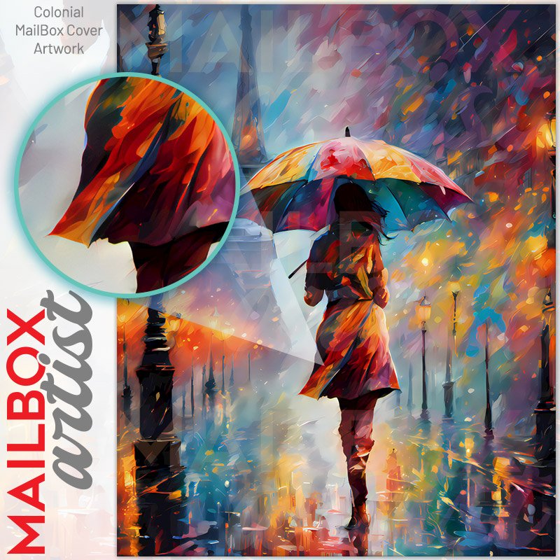 With this Walking in a Rainy City colonial mailbox cover it’s pretty easy to convert your mailbox to a special and unique item. These covers require a flat surface, so they work with colonial mailboxes that do not have any embossed decoration or signs. Magnetic mailbox covers work with steel colonial boxes only, while self-adhesive vinyl covers are available for aluminum, plastic and steel boxes. We also offer both self-adhesive and magnetic covers with regular opaque white vinyl or reflective vinyl, which works similarly to license plates or road signs. The reflective option makes the entire cover’s surface reflective, ensuring visibility at night. In case your mailbox doesn’t work with these covers, you can purchase the preinstalled cover on a brand new mailbox as well. Also, you can create your custom colonial mailbox cover using you own pictures, adding your name, street number, etc.