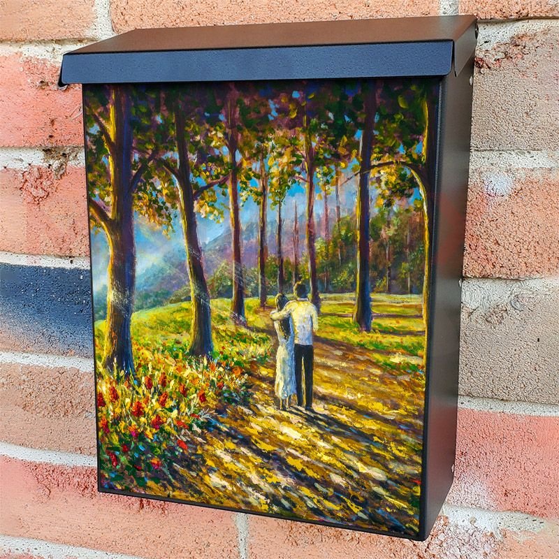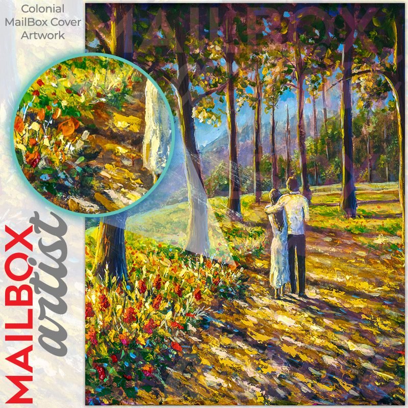 With this Walking in a Sunny Park colonial mailbox cover it’s pretty easy to convert your mailbox to a special and unique item. These covers require a flat surface, so they work with colonial mailboxes that do not have any embossed decoration or signs. Magnetic mailbox covers work with steel colonial boxes only, while self-adhesive vinyl covers are available for aluminum, plastic and steel boxes. We also offer both self-adhesive and magnetic covers with regular opaque white vinyl or reflective vinyl, which works similarly to license plates or road signs. The reflective option makes the entire cover’s surface reflective, ensuring visibility at night. In case your mailbox doesn’t work with these covers, you can purchase the preinstalled cover on a brand new mailbox as well. Also, you can create your custom colonial mailbox cover using you own pictures, adding your name, street number, etc.