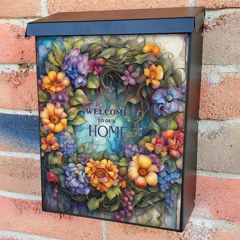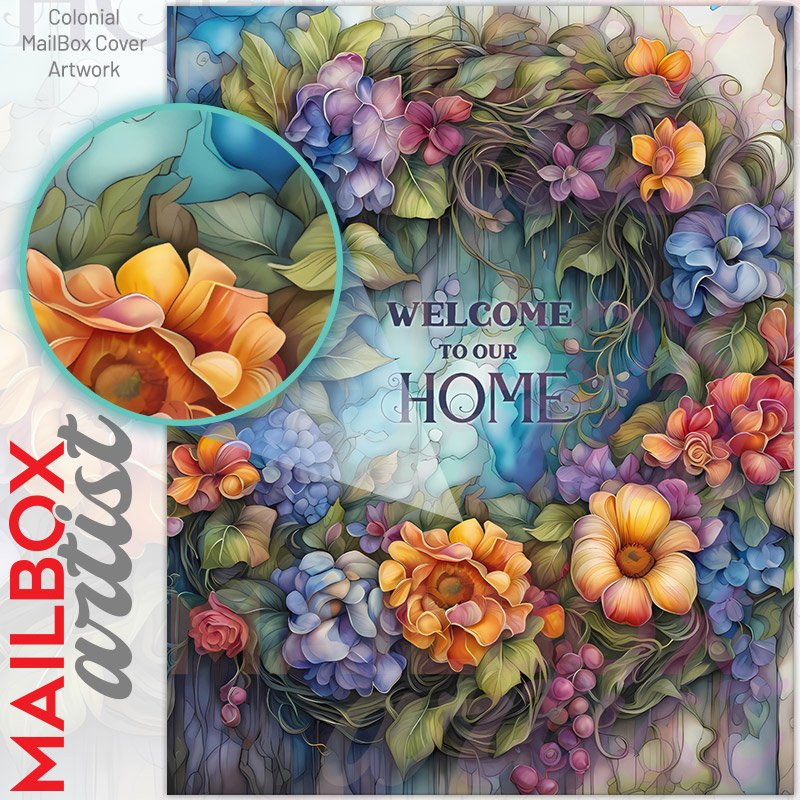 With this Welcome to Our Home Wreath colonial mailbox cover it’s pretty easy to convert your mailbox to a special and unique item. These covers require a flat surface, so they work with colonial mailboxes that do not have any embossed decoration or signs. Magnetic mailbox covers work with steel colonial boxes only, while self-adhesive vinyl covers are available for aluminum, plastic and steel boxes. We also offer both self-adhesive and magnetic covers with regular opaque white vinyl or reflective vinyl, which works similarly to license plates or road signs. The reflective option makes the entire cover’s surface reflective, ensuring visibility at night. In case your mailbox doesn’t work with these covers, you can purchase the preinstalled cover on a brand new mailbox as well. Also, you can create your custom colonial mailbox cover using you own pictures, adding your name, street number, etc.