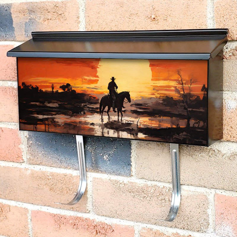 Applying your Western Cowboy Desert Horse 1 townhouse / ranch mailbox cover it’s pretty easy to convert your mailbox to a special and unique item. These covers require a flat surface, so they work with townhouse / ranch mailboxes that do not have any embossed decoration or signs. Magnetic mailbox covers work with steel boxes, for aluminum and plastic boxes we offer the self-adhesive vinyl covers. In case your mailbox doesn’t work with these covers, you can purchase the preinstalled cover on a brand new mailbox as well. Also, you can create your custom townhouse / ranch mailbox cover using you own pictures, adding your name, street number, etc.