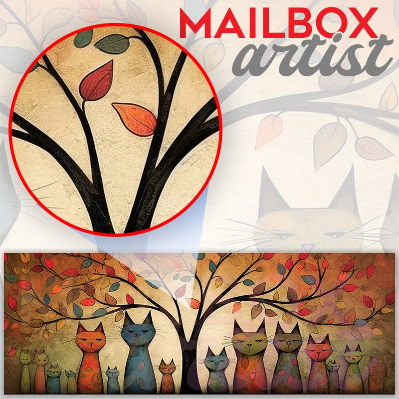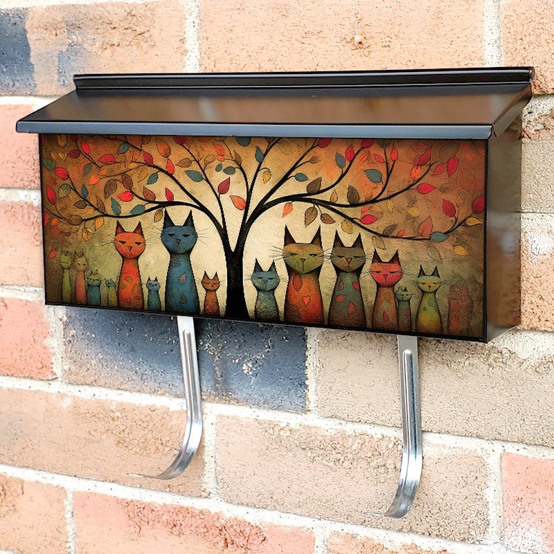Applying your Whimsical Cat Family Portrait townhouse / ranch mailbox cover it’s pretty easy to convert your mailbox to a special and unique item. These covers require a flat surface, so they work with townhouse / ranch mailboxes that do not have any embossed decoration or signs. Magnetic mailbox covers work with steel boxes, for aluminum and plastic boxes we offer the self-adhesive vinyl covers. In case your mailbox doesn’t work with these covers, you can purchase the preinstalled cover on a brand new mailbox as well. Also, you can create your custom townhouse / ranch mailbox cover using you own pictures, adding your name, street number, etc.