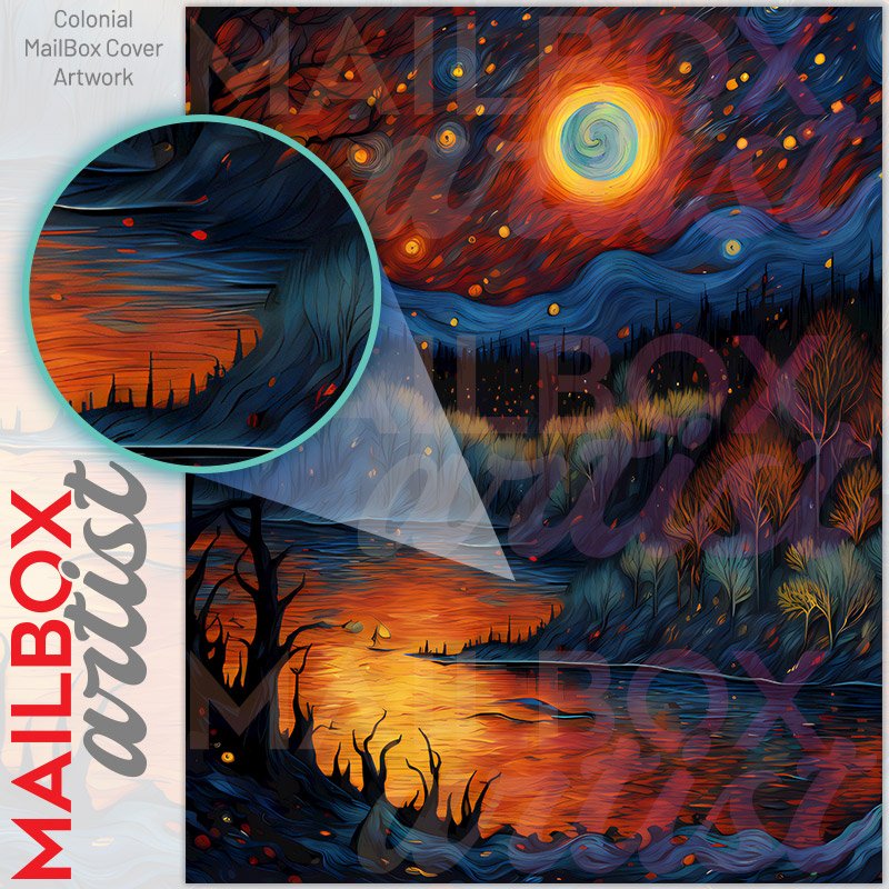 With this Whimsical Starry Autumn Night colonial mailbox cover it’s pretty easy to convert your mailbox to a special and unique item. These covers require a flat surface, so they work with colonial mailboxes that do not have any embossed decoration or signs. Magnetic mailbox covers work with steel colonial boxes only, while self-adhesive vinyl covers are available for aluminum, plastic and steel boxes. We also offer both self-adhesive and magnetic covers with regular opaque white vinyl or reflective vinyl, which works similarly to license plates or road signs. The reflective option makes the entire cover’s surface reflective, ensuring visibility at night. In case your mailbox doesn’t work with these covers, you can purchase the preinstalled cover on a brand new mailbox as well. Also, you can create your custom colonial mailbox cover using you own pictures, adding your name, street number, etc.
