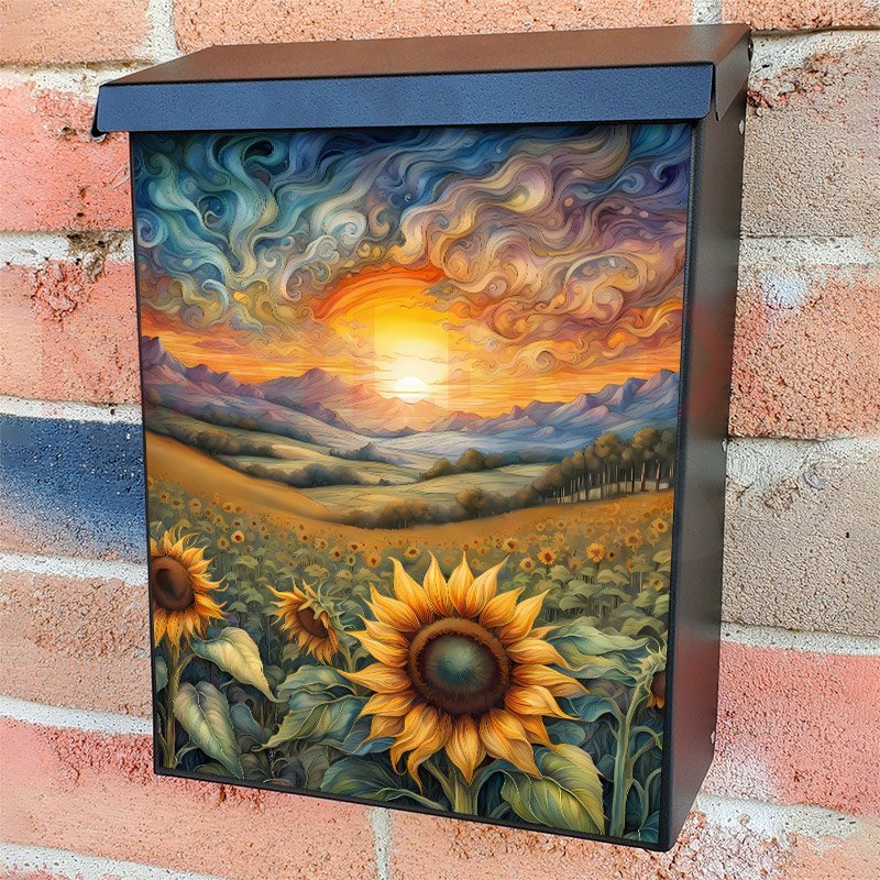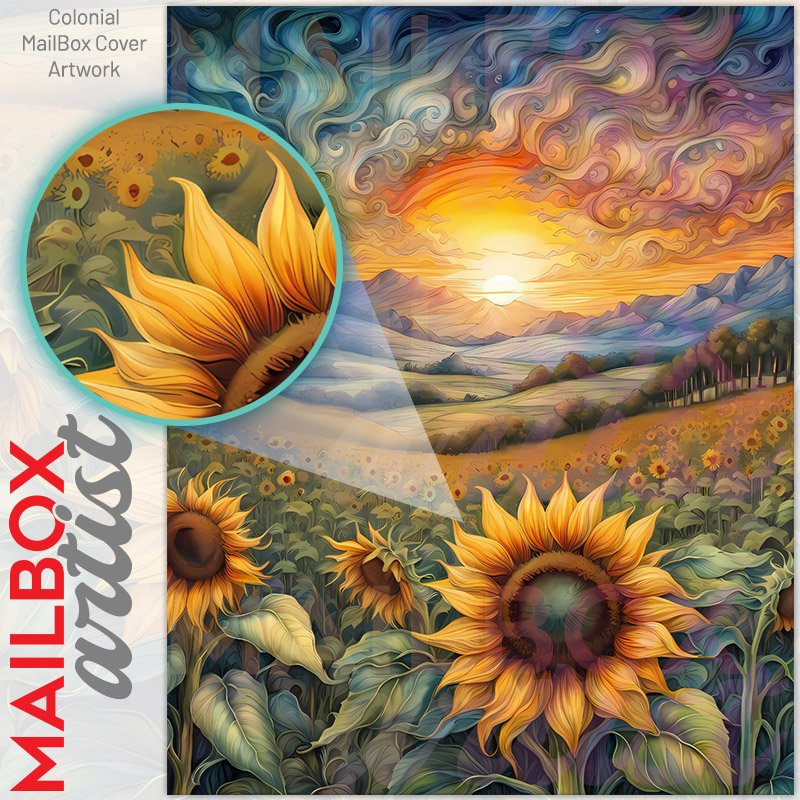 With this Whimsical Sunflower Field colonial mailbox cover it’s pretty easy to convert your mailbox to a special and unique item. These covers require a flat surface, so they work with colonial mailboxes that do not have any embossed decoration or signs. Magnetic mailbox covers work with steel colonial boxes only, while self-adhesive vinyl covers are available for aluminum, plastic and steel boxes. We also offer both self-adhesive and magnetic covers with regular opaque white vinyl or reflective vinyl, which works similarly to license plates or road signs. The reflective option makes the entire cover’s surface reflective, ensuring visibility at night. In case your mailbox doesn’t work with these covers, you can purchase the preinstalled cover on a brand new mailbox as well. Also, you can create your custom colonial mailbox cover using you own pictures, adding your name, street number, etc.