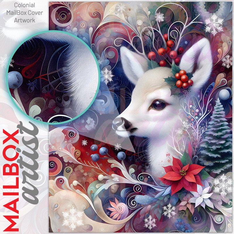 With this White Christmas Baby Deer colonial mailbox cover it’s pretty easy to convert your mailbox to a special and unique item. These covers require a flat surface, so they work with colonial mailboxes that do not have any embossed decoration or signs. Magnetic mailbox covers work with steel colonial boxes only, while self-adhesive vinyl covers are available for aluminum, plastic and steel boxes. We also offer both self-adhesive and magnetic covers with regular opaque white vinyl or reflective vinyl, which works similarly to license plates or road signs. The reflective option makes the entire cover’s surface reflective, ensuring visibility at night. In case your mailbox doesn’t work with these covers, you can purchase the preinstalled cover on a brand new mailbox as well. Also, you can create your custom colonial mailbox cover using you own pictures, adding your name, street number, etc.