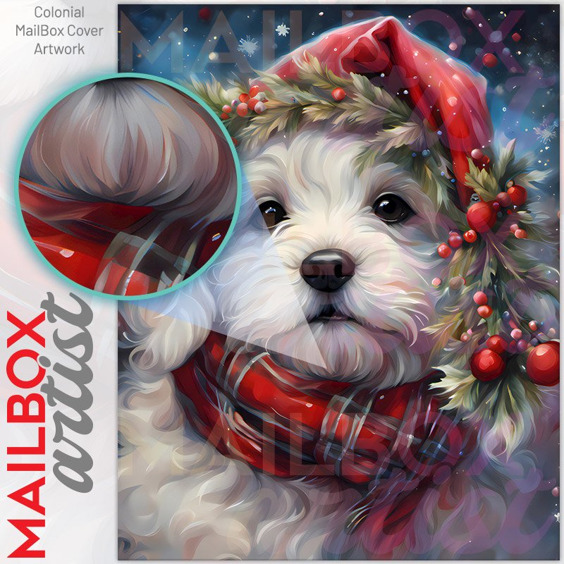 With this White Christmas Puppy in the Snowfall colonial mailbox cover it’s pretty easy to convert your mailbox to a special and unique item. These covers require a flat surface, so they work with colonial mailboxes that do not have any embossed decoration or signs. Magnetic mailbox covers work with steel colonial boxes only, while self-adhesive vinyl covers are available for aluminum, plastic and steel boxes. We also offer both self-adhesive and magnetic covers with regular opaque white vinyl or reflective vinyl, which works similarly to license plates or road signs. The reflective option makes the entire cover’s surface reflective, ensuring visibility at night. In case your mailbox doesn’t work with these covers, you can purchase the preinstalled cover on a brand new mailbox as well. Also, you can create your custom colonial mailbox cover using you own pictures, adding your name, street number, etc.