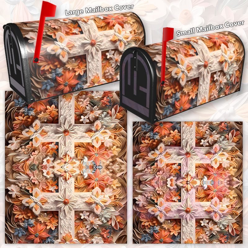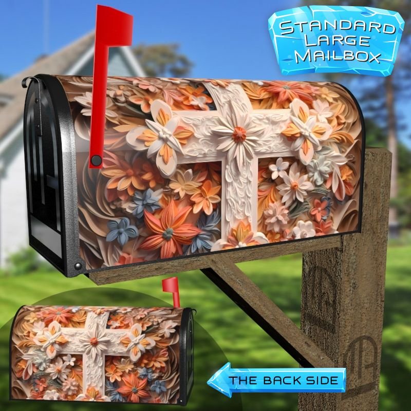 Dressing up your rural farm mailbox with the White Cross and Flowers mailbox cover is an easy way to convert it into a unique and special item. These covers require a smooth surface, so they are compatible with rural farm mailboxes that do not have any embossed decorations or signs. Magnetic mailbox covers work with steel boxes only, while self-adhesive vinyl covers are available for aluminum, plastic and steel boxes. If your mailbox is not compatible with these covers, you can purchase a brand new mailbox with a preinstalled cover. Additionally, you have the option to create a custom rural farm mailbox cover with your own pictures, name, street number, etc.
