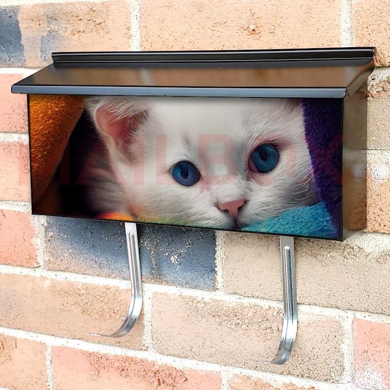Applying your White Kitten Hiding in the Towels townhouse / ranch mailbox cover it’s pretty easy to convert your mailbox to a special and unique item. These covers require a flat surface, so they work with townhouse / ranch mailboxes that do not have any embossed decoration or signs. Magnetic mailbox covers work with steel boxes, for aluminum and plastic boxes we offer the self-adhesive vinyl covers. In case your mailbox doesn’t work with these covers, you can purchase the preinstalled cover on a brand new mailbox as well. Also, you can create your custom townhouse / ranch mailbox cover using you own pictures, adding your name, street number, etc.