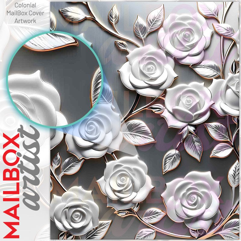 With this White Metal Roses colonial mailbox cover it’s pretty easy to convert your mailbox to a special and unique item. These covers require a flat surface, so they work with colonial mailboxes that do not have any embossed decoration or signs. Magnetic mailbox covers work with steel colonial boxes only, while self-adhesive vinyl covers are available for aluminum, plastic and steel boxes. We also offer both self-adhesive and magnetic covers with regular opaque white vinyl or reflective vinyl, which works similarly to license plates or road signs. The reflective option makes the entire cover’s surface reflective, ensuring visibility at night. In case your mailbox doesn’t work with these covers, you can purchase the preinstalled cover on a brand new mailbox as well. Also, you can create your custom colonial mailbox cover using you own pictures, adding your name, street number, etc.