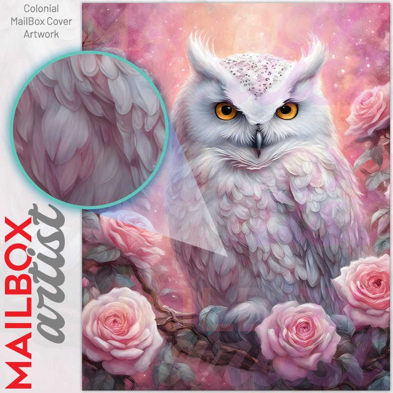 With this White Owl and Roses colonial mailbox cover it’s pretty easy to convert your mailbox to a special and unique item. These covers require a flat surface, so they work with colonial mailboxes that do not have any embossed decoration or signs. Magnetic mailbox covers work with steel colonial boxes only, while self-adhesive vinyl covers are available for aluminum, plastic and steel boxes. We also offer both self-adhesive and magnetic covers with regular opaque white vinyl or reflective vinyl, which works similarly to license plates or road signs. The reflective option makes the entire cover’s surface reflective, ensuring visibility at night. In case your mailbox doesn’t work with these covers, you can purchase the preinstalled cover on a brand new mailbox as well. Also, you can create your custom colonial mailbox cover using you own pictures, adding your name, street number, etc.