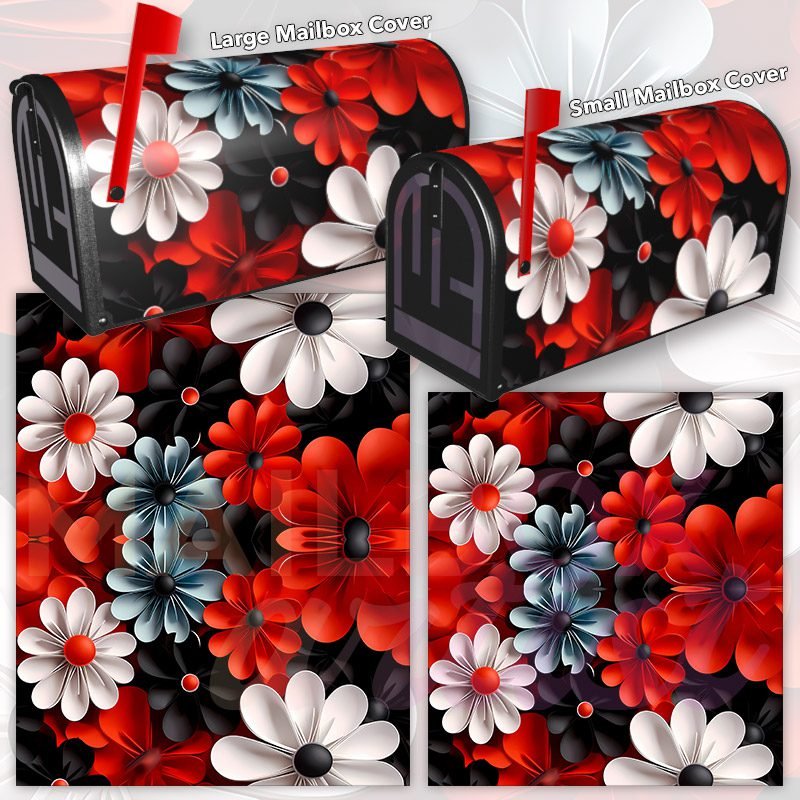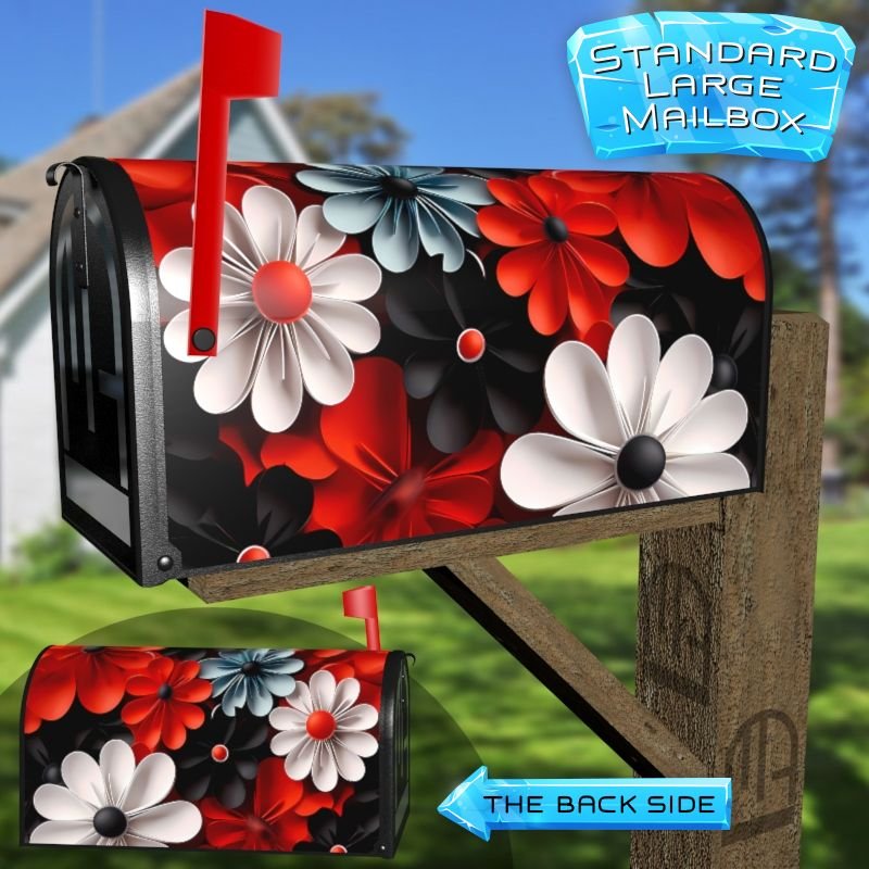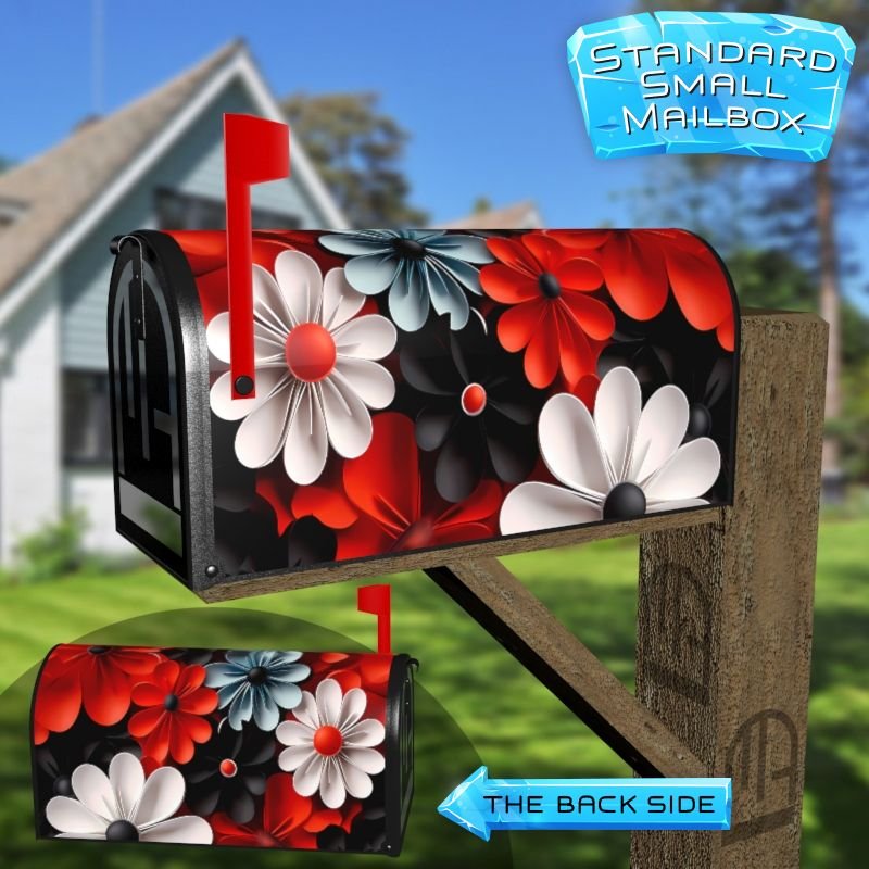 Dressing up your rural farm mailbox with the White Red and Black Flowers mailbox cover is an easy way to convert it into a unique and special item. These covers require a smooth surface, so they are compatible with rural farm mailboxes that do not have any embossed decorations or signs. Magnetic mailbox covers work with steel boxes only, while self-adhesive vinyl covers are available for aluminum, plastic and steel boxes. If your mailbox is not compatible with these covers, you can purchase a brand new mailbox with a preinstalled cover. Additionally, you have the option to create a custom rural farm mailbox cover with your own pictures, name, street number, etc.