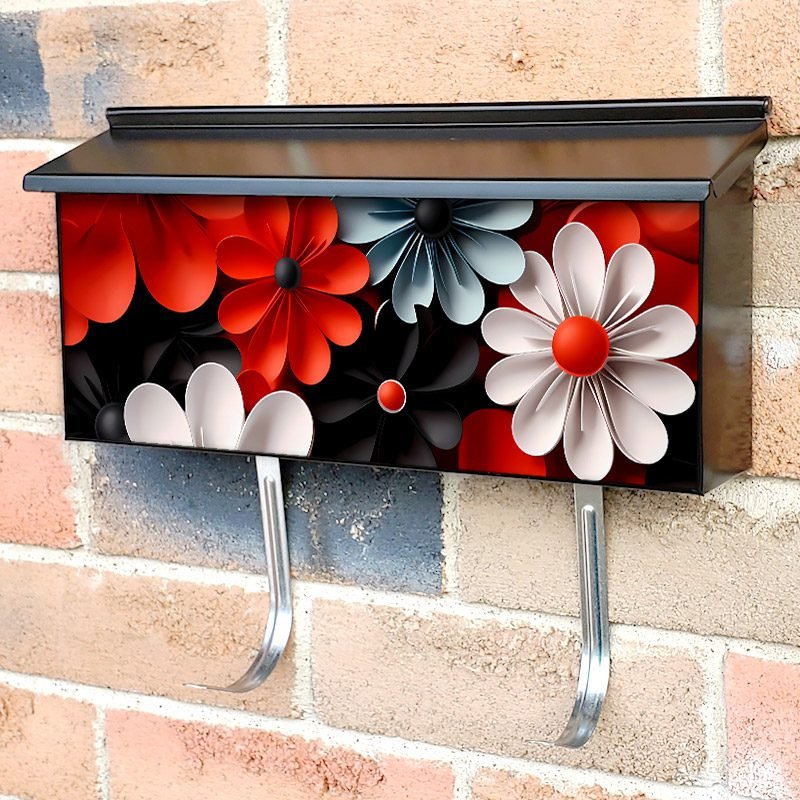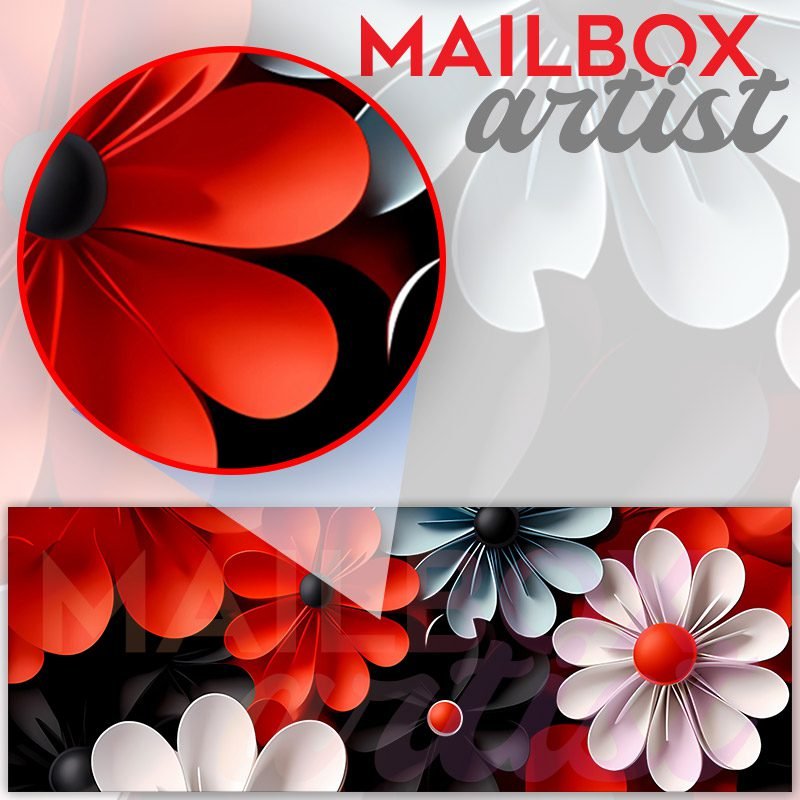 Applying your White Red and Black Flowers townhouse / ranch mailbox cover it’s pretty easy to convert your mailbox to a special and unique item. These covers require a flat surface, so they work with townhouse / ranch mailboxes that do not have any embossed decoration or signs. Magnetic mailbox covers work with steel boxes, for aluminum and plastic boxes we offer the self-adhesive vinyl covers. In case your mailbox doesn’t work with these covers, you can purchase the preinstalled cover on a brand new mailbox as well. Also, you can create your custom townhouse / ranch mailbox cover using you own pictures, adding your name, street number, etc.