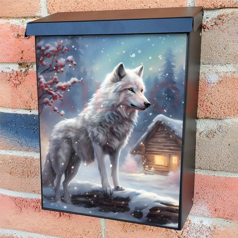 With this White Winter Wolf at the Cottage colonial mailbox cover it’s pretty easy to convert your mailbox to a special and unique item. These covers require a flat surface, so they work with colonial mailboxes that do not have any embossed decoration or signs. Magnetic mailbox covers work with steel colonial boxes only, while self-adhesive vinyl covers are available for aluminum, plastic and steel boxes. We also offer both self-adhesive and magnetic covers with regular opaque white vinyl or reflective vinyl, which works similarly to license plates or road signs. The reflective option makes the entire cover’s surface reflective, ensuring visibility at night. In case your mailbox doesn’t work with these covers, you can purchase the preinstalled cover on a brand new mailbox as well. Also, you can create your custom colonial mailbox cover using you own pictures, adding your name, street number, etc.