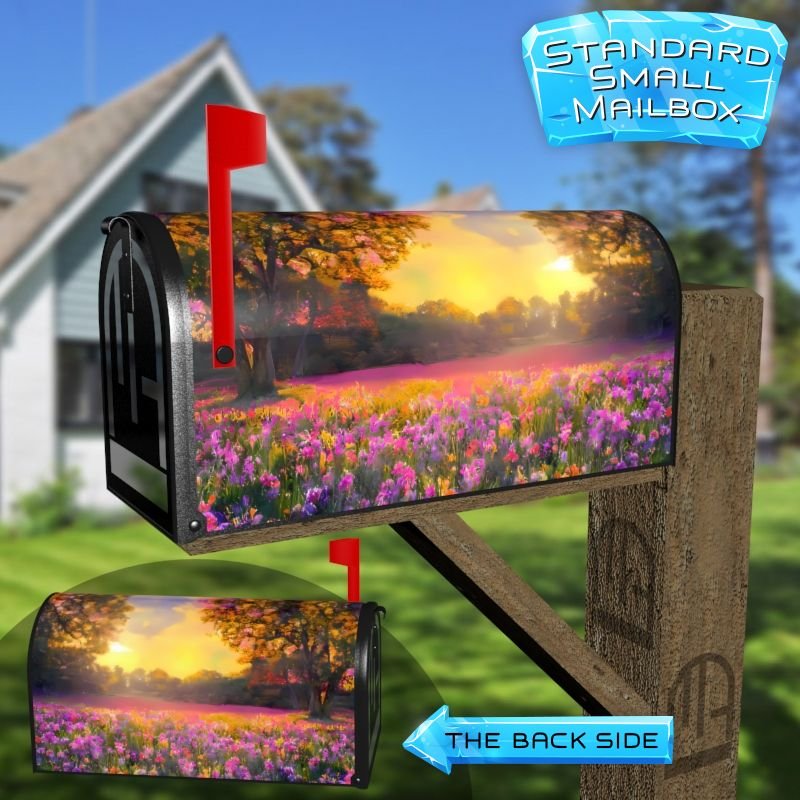 Dressing up your rural farm mailbox with the Wildflower Meadow mailbox cover is an easy way to convert it into a unique and special item. These covers require a smooth surface, so they are compatible with rural farm mailboxes that do not have any embossed decorations or signs. Magnetic mailbox covers work with steel boxes only, while self-adhesive vinyl covers are available for aluminum, plastic and steel boxes. If your mailbox is not compatible with these covers, you can purchase a brand new mailbox with a preinstalled cover. Additionally, you have the option to create a custom rural farm mailbox cover with your own pictures, name, street number, etc.