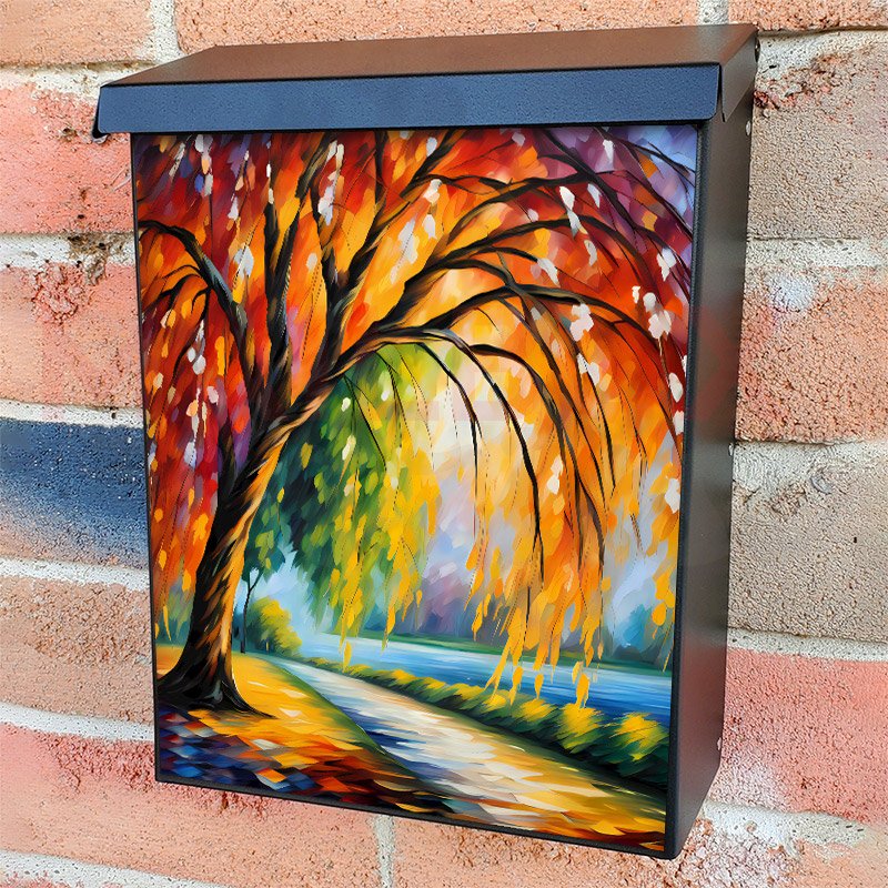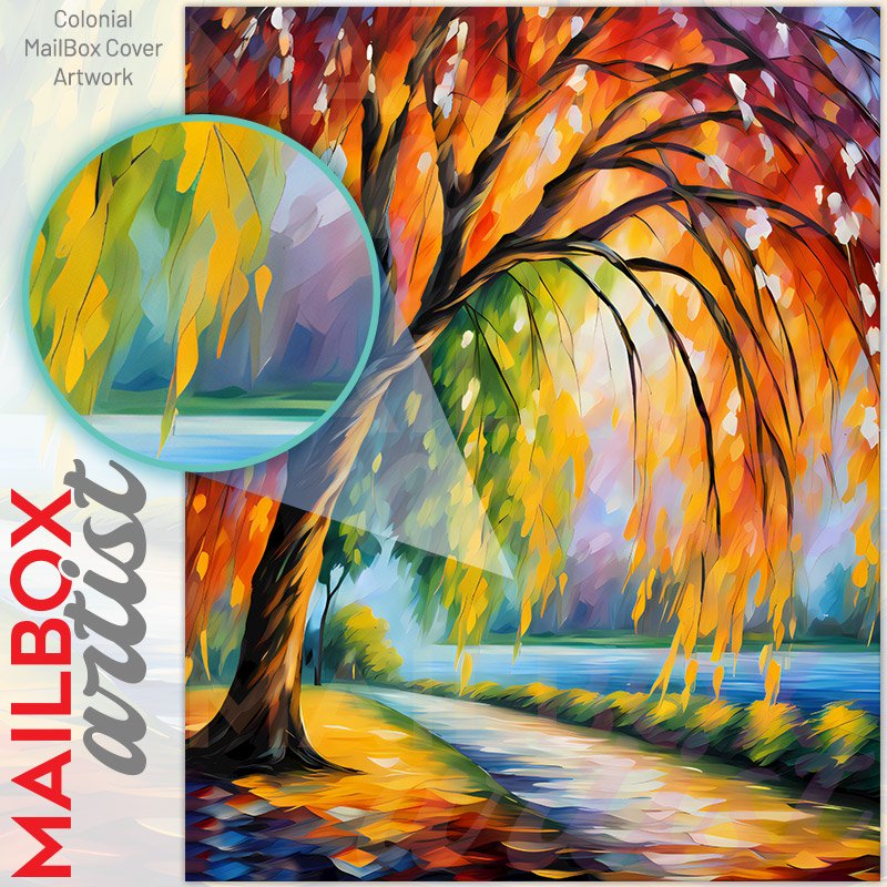 With this Willow Tree in the Park colonial mailbox cover it’s pretty easy to convert your mailbox to a special and unique item. These covers require a flat surface, so they work with colonial mailboxes that do not have any embossed decoration or signs. Magnetic mailbox covers work with steel colonial boxes only, while self-adhesive vinyl covers are available for aluminum, plastic and steel boxes. We also offer both self-adhesive and magnetic covers with regular opaque white vinyl or reflective vinyl, which works similarly to license plates or road signs. The reflective option makes the entire cover’s surface reflective, ensuring visibility at night. In case your mailbox doesn’t work with these covers, you can purchase the preinstalled cover on a brand new mailbox as well. Also, you can create your custom colonial mailbox cover using you own pictures, adding your name, street number, etc.