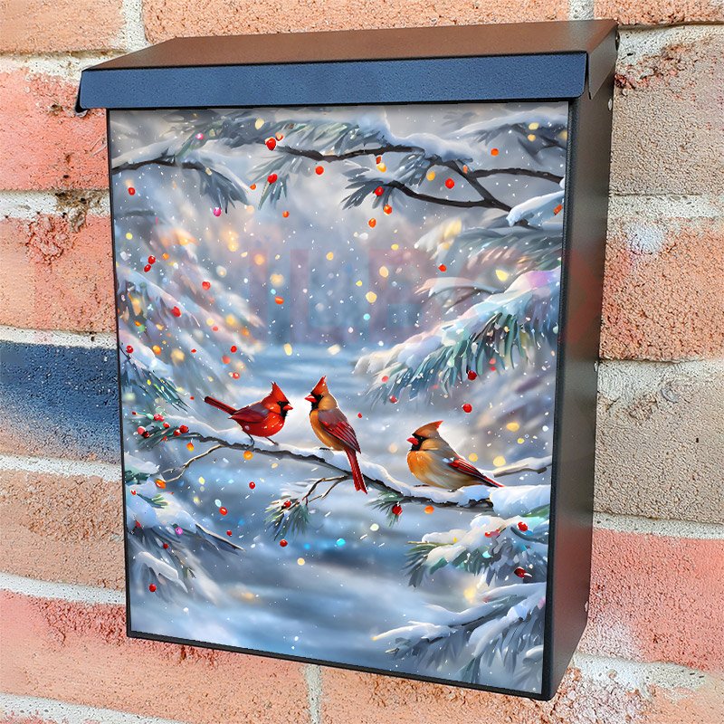 With this Winter Cardinals on the Tree colonial mailbox cover it’s pretty easy to convert your mailbox to a special and unique item. These covers require a flat surface, so they work with colonial mailboxes that do not have any embossed decoration or signs. Magnetic mailbox covers work with steel colonial boxes only, while self-adhesive vinyl covers are available for aluminum, plastic and steel boxes. We also offer both self-adhesive and magnetic covers with regular opaque white vinyl or reflective vinyl, which works similarly to license plates or road signs. The reflective option makes the entire cover’s surface reflective, ensuring visibility at night. In case your mailbox doesn’t work with these covers, you can purchase the preinstalled cover on a brand new mailbox as well. Also, you can create your custom colonial mailbox cover using you own pictures, adding your name, street number, etc.