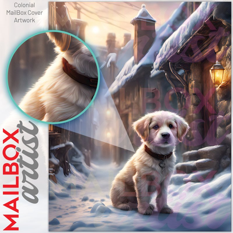With this Winter Puppy in an Old Village colonial mailbox cover it’s pretty easy to convert your mailbox to a special and unique item. These covers require a flat surface, so they work with colonial mailboxes that do not have any embossed decoration or signs. Magnetic mailbox covers work with steel colonial boxes only, while self-adhesive vinyl covers are available for aluminum, plastic and steel boxes. We also offer both self-adhesive and magnetic covers with regular opaque white vinyl or reflective vinyl, which works similarly to license plates or road signs. The reflective option makes the entire cover’s surface reflective, ensuring visibility at night. In case your mailbox doesn’t work with these covers, you can purchase the preinstalled cover on a brand new mailbox as well. Also, you can create your custom colonial mailbox cover using you own pictures, adding your name, street number, etc.