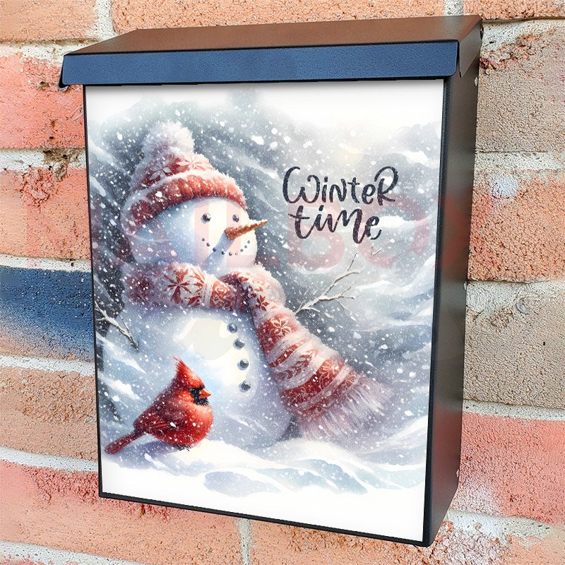 With this Winter Time Snowman and Cardinal colonial mailbox cover it’s pretty easy to convert your mailbox to a special and unique item. These covers require a flat surface, so they work with colonial mailboxes that do not have any embossed decoration or signs. Magnetic mailbox covers work with steel colonial boxes only, while self-adhesive vinyl covers are available for aluminum, plastic and steel boxes. We also offer both self-adhesive and magnetic covers with regular opaque white vinyl or reflective vinyl, which works similarly to license plates or road signs. The reflective option makes the entire cover’s surface reflective, ensuring visibility at night. In case your mailbox doesn’t work with these covers, you can purchase the preinstalled cover on a brand new mailbox as well. Also, you can create your custom colonial mailbox cover using you own pictures, adding your name, street number, etc.