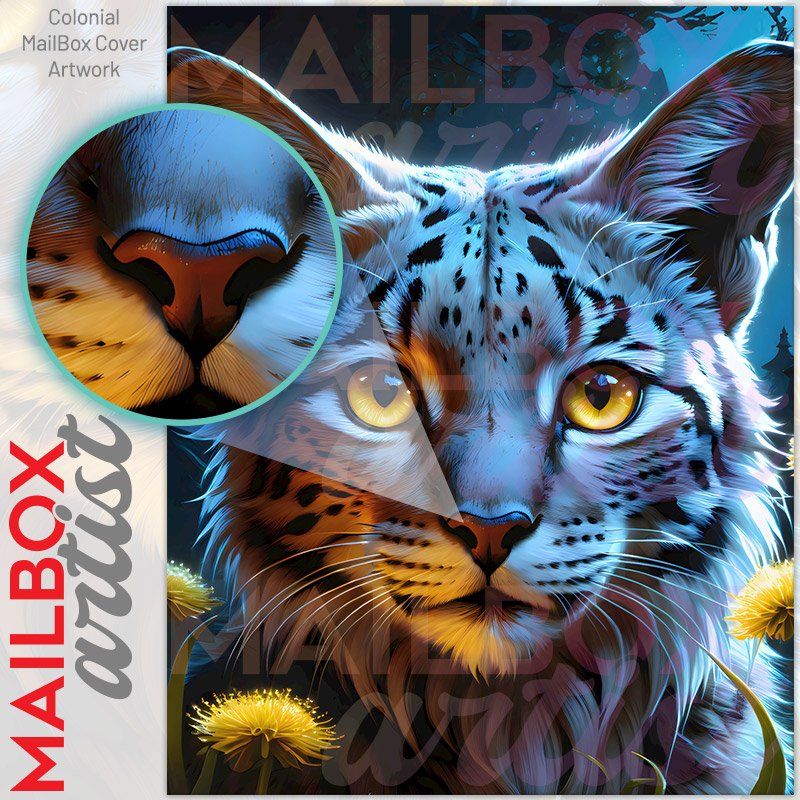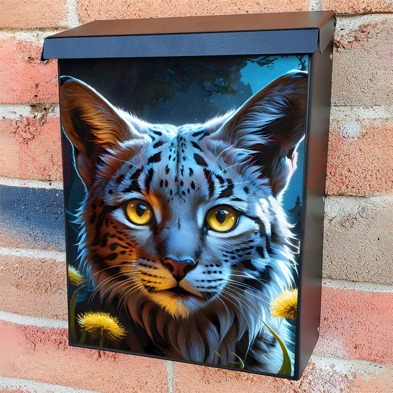 With this Young Lynx at Night colonial mailbox cover it’s pretty easy to convert your mailbox to a special and unique item. These covers require a flat surface, so they work with colonial mailboxes that do not have any embossed decoration or signs. Magnetic mailbox covers work with steel colonial boxes only, while self-adhesive vinyl covers are available for aluminum, plastic and steel boxes. We also offer both self-adhesive and magnetic covers with regular opaque white vinyl or reflective vinyl, which works similarly to license plates or road signs. The reflective option makes the entire cover’s surface reflective, ensuring visibility at night. In case your mailbox doesn’t work with these covers, you can purchase the preinstalled cover on a brand new mailbox as well. Also, you can create your custom colonial mailbox cover using you own pictures, adding your name, street number, etc.